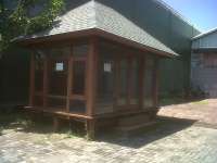 gazebo ukuran 3 x 4 menggunakan kayu merbau, finish mowilex, atap genteng GAF.
